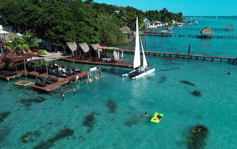 Bertilla Lagoon & Beach Club, located at El Buho Hotel in Bacalar, close to Cenote Negro, offers a perfect mix of relaxation and adventure. Enjoy stunning views of the Bacalar Lagoon while lounging on comfortable beds, sun loungers, or in hammocks, and explore the lagoon with kayaks and paddle boards. Families can also take advantage of the dedicated children’s area. The on-site restaurant, Bertilla, serves homemade Italian dishes, including gourmet pasta dishes and pizzas, and for seafood lovers, the menu includes tuna tartare, ceviche, and aguachile. Guests can also indulge in freshly prepared bruschetta and carpaccios. There is even an option for diners to build their own pizza or salad. For a truly special experience, the private overwater cabanas are available for intimate dinners by the lagoon in the evenings.
